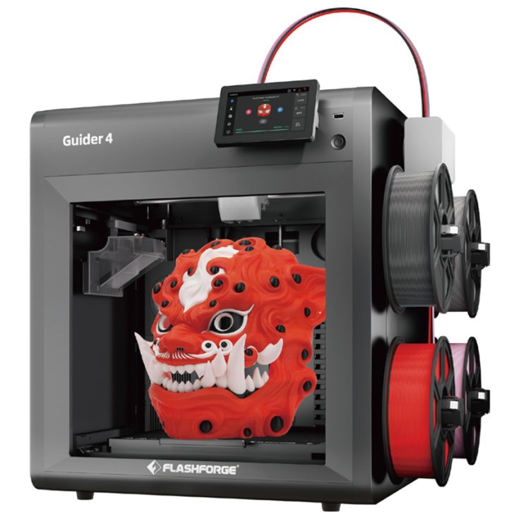 Flashforge Guider 4 обладает внушительным объемом построения 300x300x300 мм, что позволяет с легкостью создавать крупногабаритные прототипы, печатать большие модели и осуществлять серийное производство.